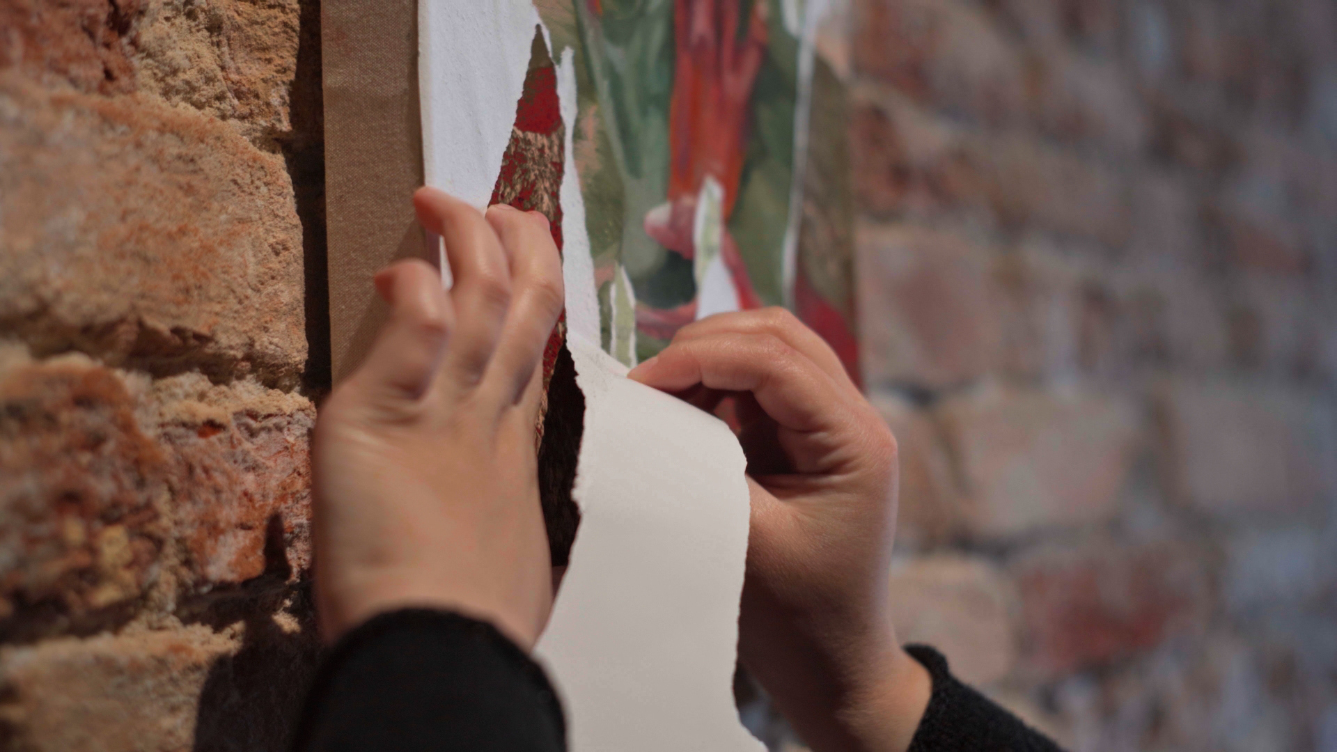 Part of a series of work titled Behind These Mountains (2025). Every piece contains a story connected to the Sierra Occidental Mountain range in between Northern Mexico and the Southwestern U.S. Photos of the deceptively scenic mountains cover each painting in which an audience was invited to peel away in a symbolic performance.