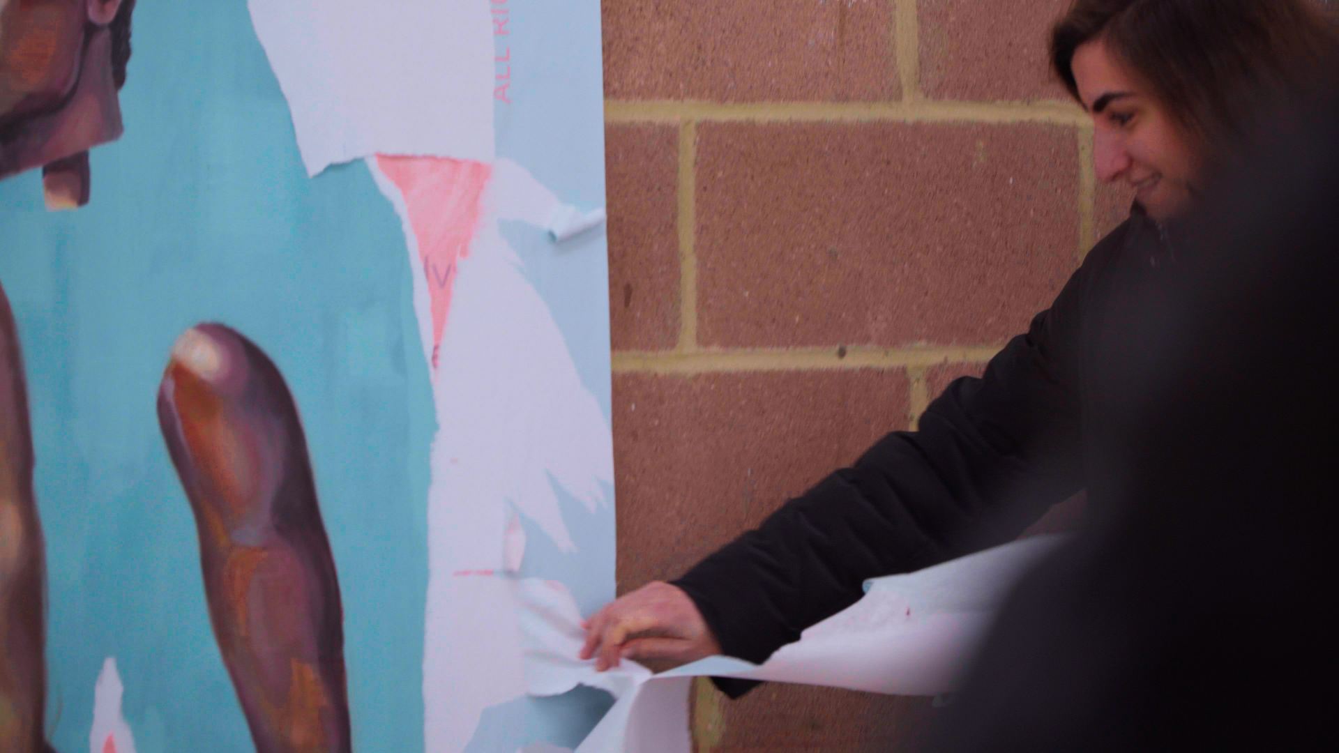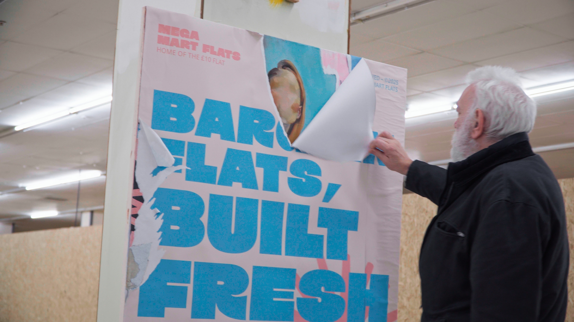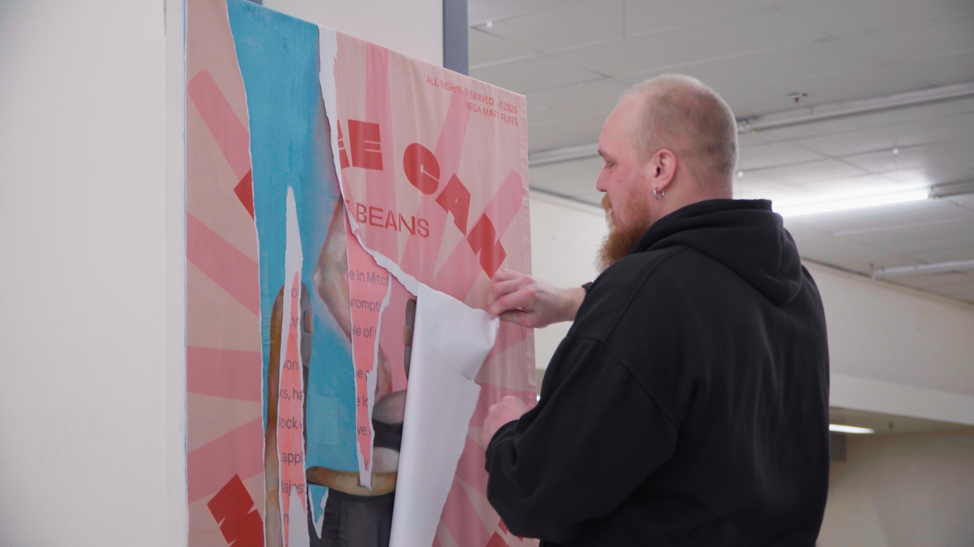 Promotional posters of a satirical retail chain with implausibly low prices cover each piece in which individuals are then invited to peel away. The act of performing “lacerations” is symbolic and denotes a desire to see beyond face value, discovering the context behind what we see. Behind the surface of each image lies layers of news articles and figurative paintings reflecting an ongoing struggle for community identity. This act of uncovering becomes central to the performative dimension, encouraging viewers to question what is obscured by polished commercial messaging.